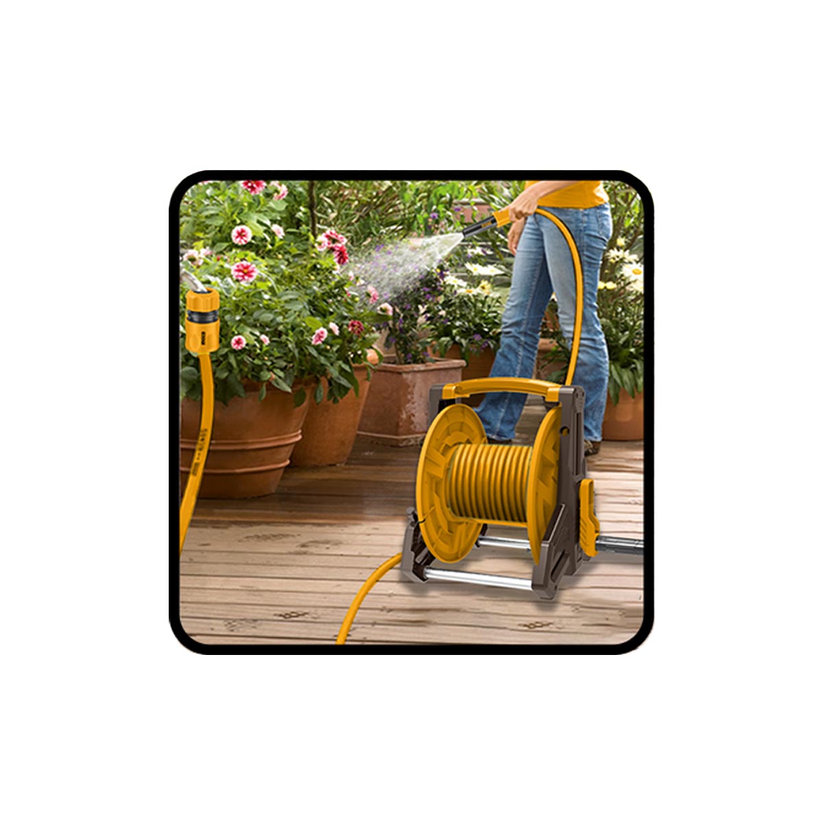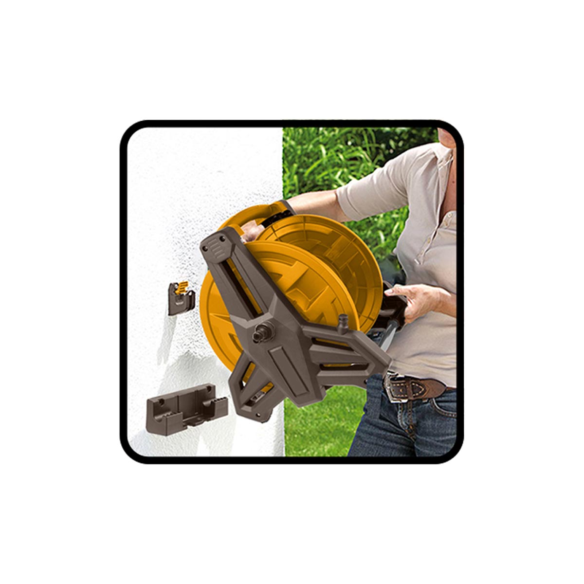 Διαθέτει αναδιπλούμενη λαβή για εύκολο και γρήγορο μάζεμα του λάστιχου, ενώ η τριγωνική δομή του καρουλιού εξασφαλίζει εξαιρετικά σταθερή στήριξη. Μπορεί να τοποθετηθεί στον τοίχο χάρη στο αλουμινένιο στήριγμα σωλήνα, εξοικονομώντας χώρο και διατηρώντας το λάστιχο οργανωμένο.