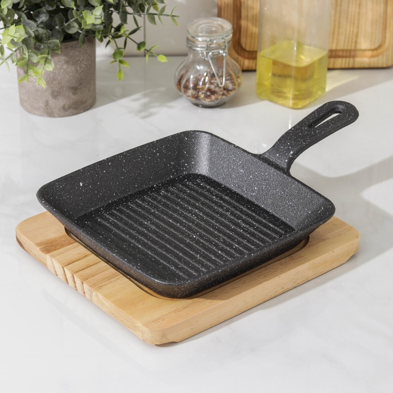 Μαντεμένιο Τετράγωνο Τηγάνι Σερβιρίσματος με Ξύλινη Βάση 16cm VC2408
