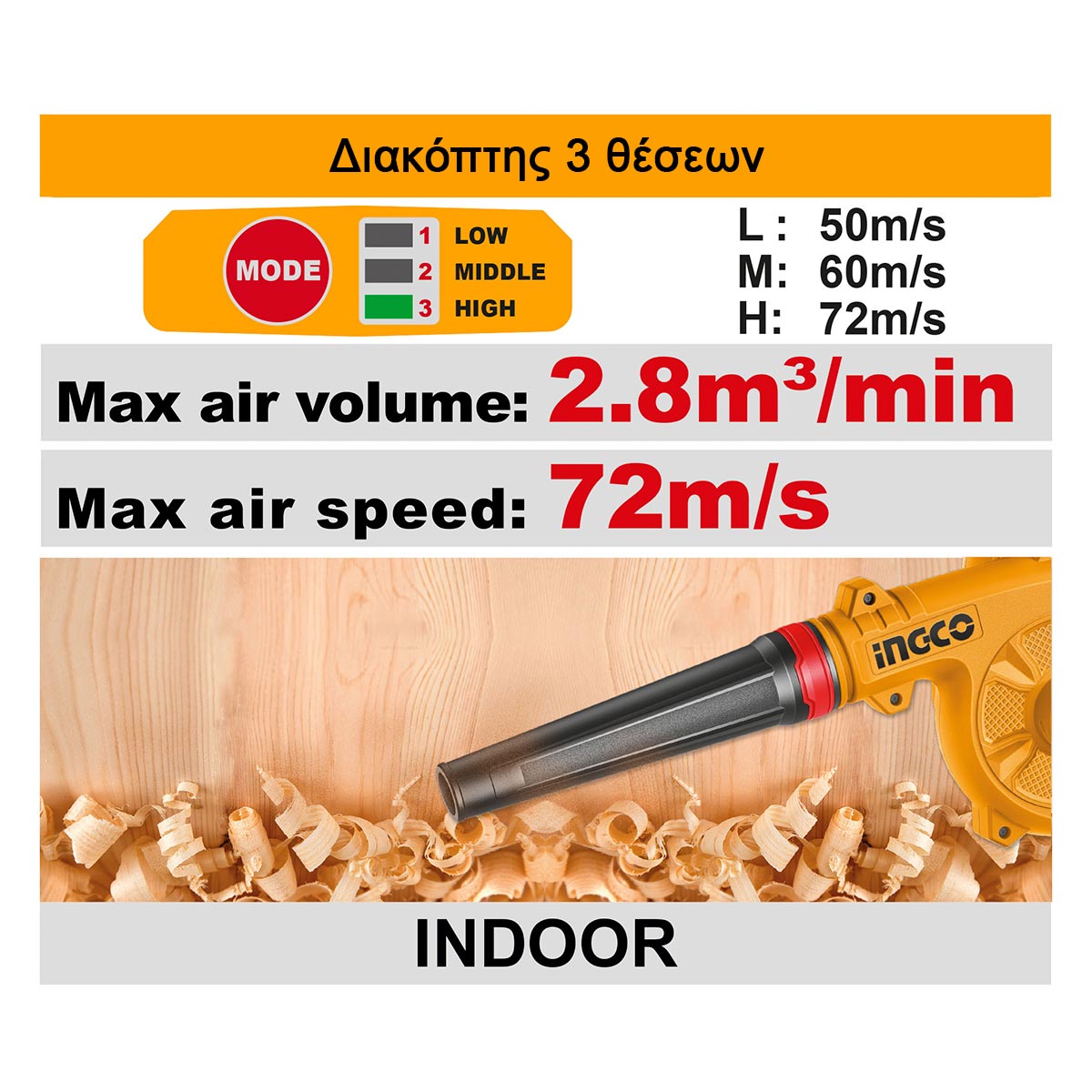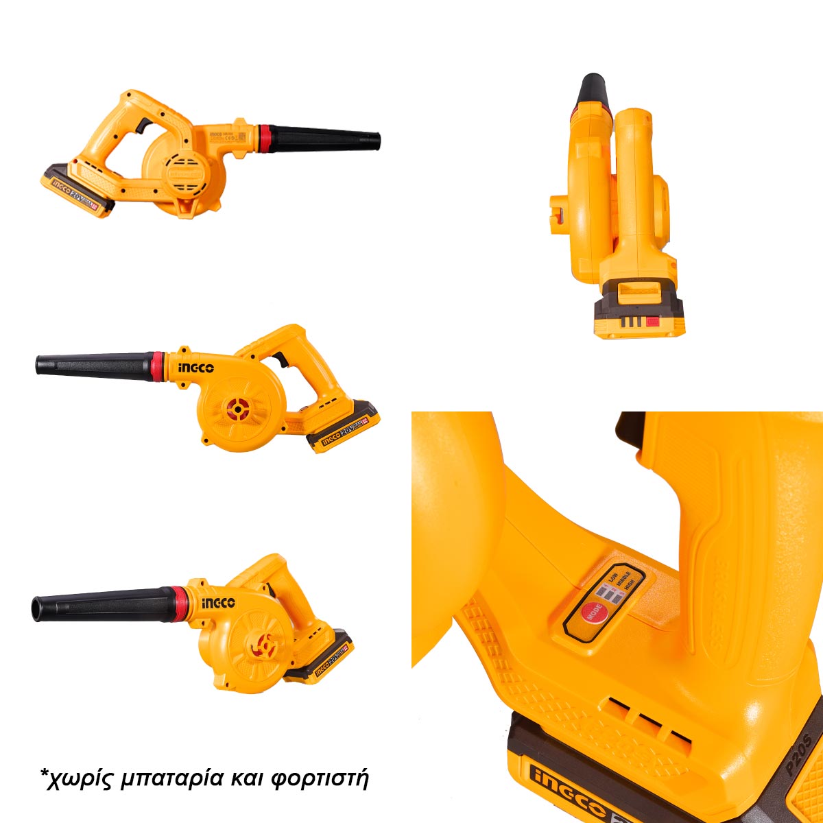 Η ηλεκτρονικά ρυθμιζόμενη ταχύτητα επιτρέπει ακριβή έλεγχο της ροής αέρα, ενώ η μέση παροχή αέρα 510 m³/h και η μέγιστη ταχύτητα αέρα 144 km/h εξασφαλίζουν γρήγορη και αποτελεσματική απομάκρυνση φύλλων και σκόνης. Το εργαλείο διατίθεται σε έκδοση SOLO, χωρίς μπαταρία και φορτιστή, και είναι συμβατό με τις μπαταρίες 20V Li-Ion της σειράς INGCO.