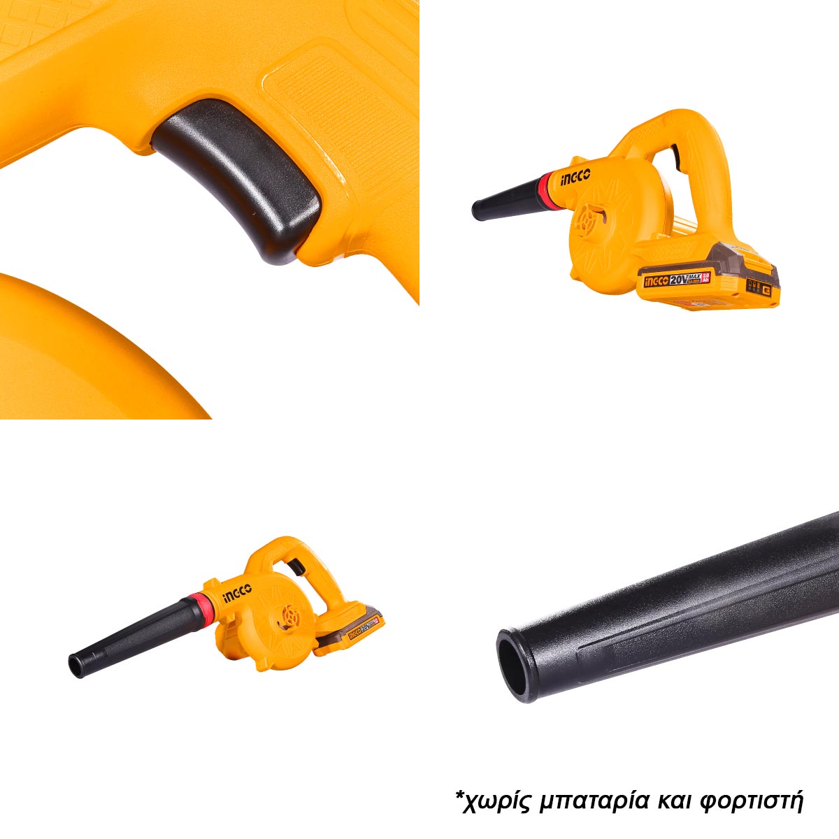 Με ταχύτητα χωρίς φορτίο έως 18.000 rpm και παροχή αέρα 2.7 m³/min, αποτελεί ιδανική λύση για καθαρισμό σε εργαστήρια, εργοτάξια, αυλές και κήπους. Το εργαλείο διατίθεται σε έκδοση SOLO, δηλαδή χωρίς μπαταρία και φορτιστή, και είναι συμβατό με τις μπαταρίες της σειράς 20V Li-Ion της INGCO.